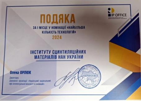 На відзначення Дня винахідника і раціоналізатора 2025 Інститут сцинтиляційних матеріалів НАН України отримав Подяку від Українського національного офісу інтелектуальної власності та інновацій за І місце у номінації "Найбільша кількість технологій" за 2024 рік.