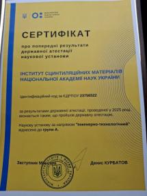 За результатами Державної атестації МОН України Інститут сцинтиляційних матеріалів НАН України набрав максимальні 100 балів й отримав категорію А